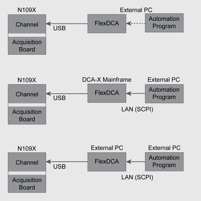對于自動測試系統(tǒng)環(huán)境,控制N1092A/B/C/D/E的最簡單和首選方法是通過LAN將主測試系統(tǒng)PC與低成本的現(xiàn)代PC相連。FlexDCA的接口位于FlexDCA接口位于第二臺PC上。