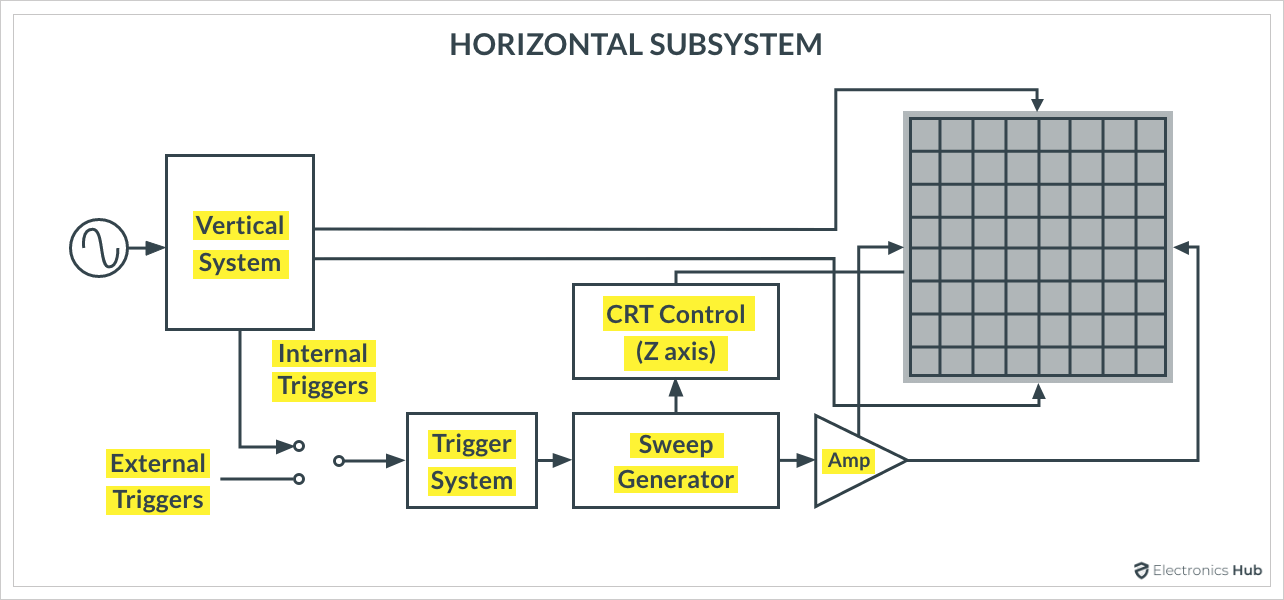 水平系統(tǒng)向水平板提供偏轉電壓,以水平移動電子束。為此,掃描發(fā)生器電路生成鋸齒(或斜坡)信號以控制光束的掃描速率。