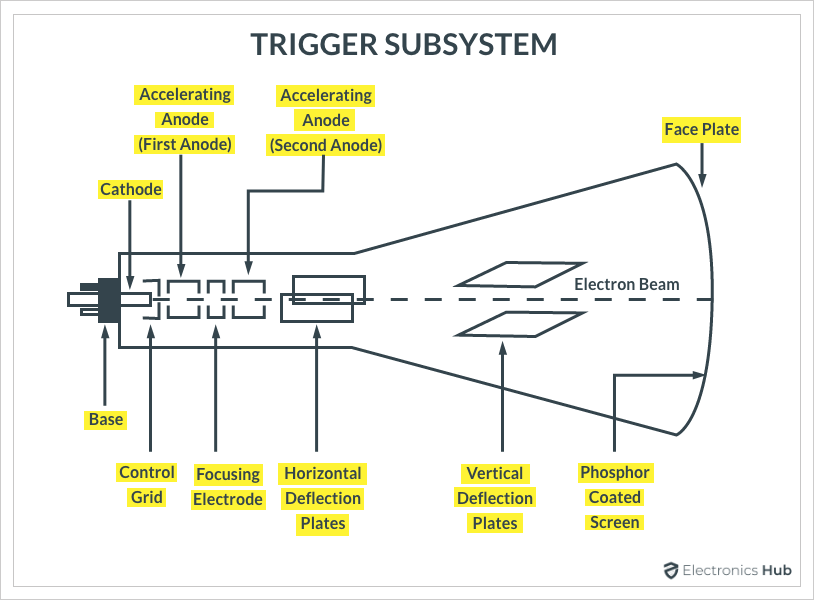 CRT 是所有模擬示波器的主要部分。如果我們能理解CRT的工作原理,那么我們就可以很容易地知道如何在CRT的屏幕上顯示波形。下圖顯示了在 CRT 上顯示波形所需的基本構建基塊。