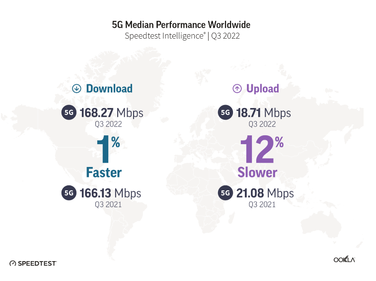 Ookla 在日前公布全球 10 個(gè)國家和地區(qū)的最快 5G 手機(jī)榜單之后,在今天公布的報(bào)告中分享了全球的 5G 網(wǎng)絡(luò)性能。在報(bào)告中顯示 2022 年第 3 季度全球 5G 網(wǎng)絡(luò)下行速度平均為 168.27 Mbps,相比較去年同期的 166.13 Mbps 快了 1%;但是平均上行速度為 18.71Mbps,比去年同期的 21.08Mbps 慢了 12%。