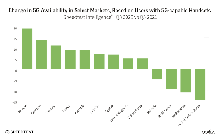 我們研究了 2022 年第三季度 Speedtest Intelligence 的數(shù)據(jù),看看 5G 的性能自去年以來有什么變化,哪里的下載速度在國家層面上是最快的,以及衛(wèi)星技術(shù)如何提供額外的連接選擇。我們還研究了尚未有 5G 的國家,以了解消費(fèi)者在哪些地方看到了 4G LTE 接入的改善。
