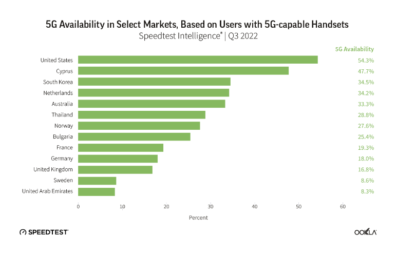 Ookla 在報(bào)告中寫道:5G 不再是一項(xiàng)新技術(shù),不過許多國家和地區(qū)的消費(fèi)者仍在等待 5G 的完全發(fā)揮(甚至某些國家和地區(qū)根本不可能連接到 5G)。