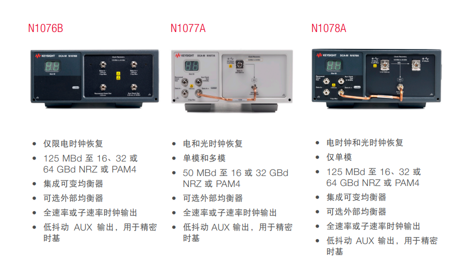 用于光和電的波形分析,N1076B電時(shí)鐘恢復(fù)到64GBd,N1077A光/電時(shí)鐘恢復(fù)到64GBd。N1077A光/電時(shí)鐘恢復(fù)可達(dá)32GBd,N1078A光/電時(shí)鐘恢復(fù)可達(dá)64GBd。32 GBd,以及N1078A光學(xué)/電學(xué)時(shí)鐘恢復(fù)高達(dá)64 GBd,提供了時(shí)鐘恢復(fù)解決方案。