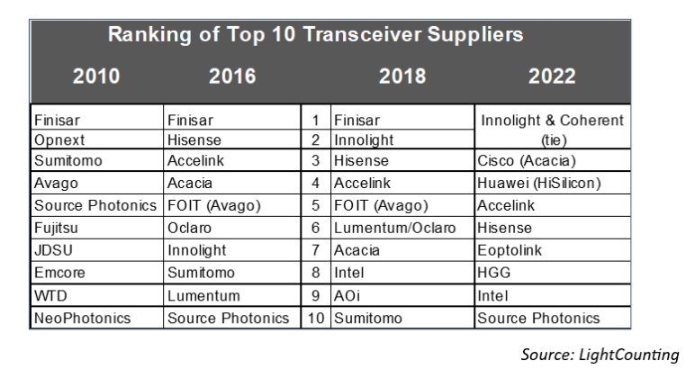 2022年,旭創(chuàng)科技(排名并列第1)、華為(排名第4)、光迅科技(排名第5)、海信寬帶(排名第6)、新易盛(排名第7)、華工正源(排名第8)、索爾思光電(排名第10)入圍。值得一提的是,索爾思光電被中國公司收購,故本期已是中國光模塊廠商。