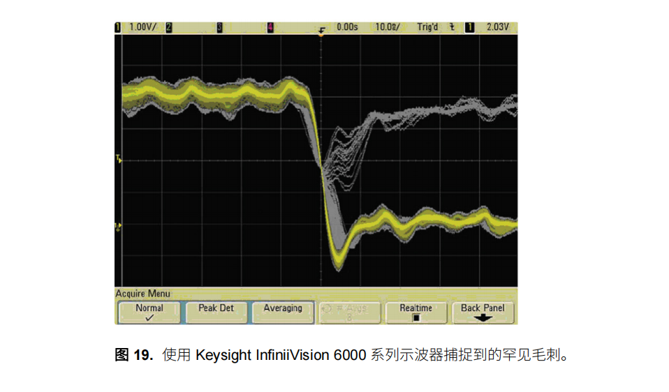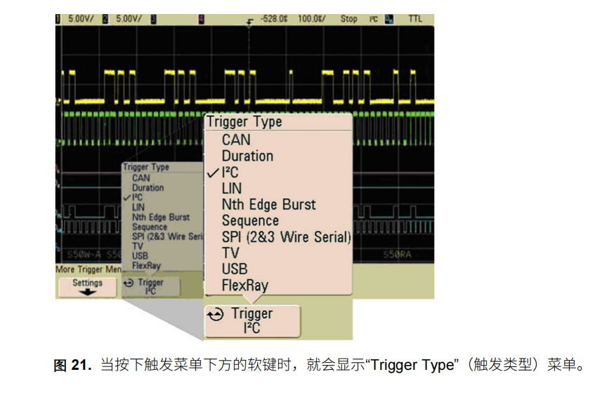 軟鍵常出現(xiàn)在未安裝 Windows 操作系統(tǒng)的示波器上(軟鍵圖片見圖 8)。 使用這些軟鍵可以導(dǎo)航示波器顯 示屏上的菜單系統(tǒng)。 圖 21 顯示了按下軟鍵時下拉菜單的樣子。 圖中顯示的是用于選擇觸發(fā)模式的菜單。 您可以連續(xù)按軟鍵進(jìn)行滾動選擇,前面板上的有一個旋鈕,也用于滾動選擇。 圖 21. 當(dāng)按下觸發(fā)菜單下方的軟鍵時,就會顯示“Trigger Type”(觸發(fā)類型)菜單。