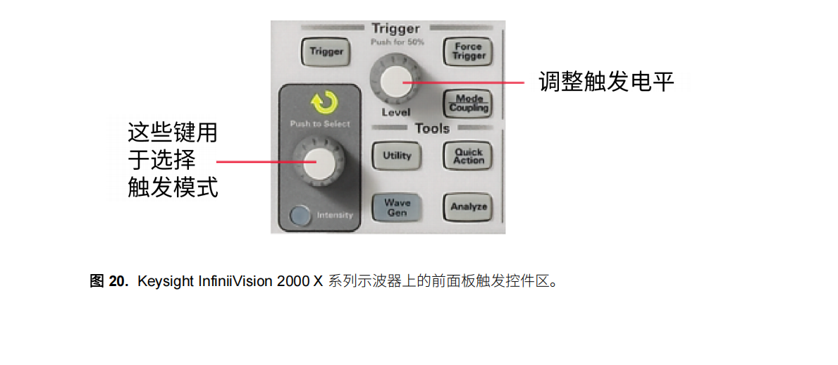 當(dāng)您需要找出特定的脈寬時,脈寬觸發(fā)與毛刺觸發(fā)功能相似。 不過,通常您可以觸發(fā)任何指定寬度的脈 沖,并且可以選擇要觸發(fā)的脈沖的極性(負(fù)或正)。 您還可以設(shè)置觸發(fā)的水平位置。 這樣一來,您就可以 看清觸發(fā)前后的情況。 例如,您可以執(zhí)行毛刺觸發(fā),找出錯誤,然后查看觸發(fā)前的信號,以確定產(chǎn)生毛刺 的原因。 如果您將水平延遲設(shè)置為零,則觸發(fā)事件將被放在屏幕水平方向的中間位置。 在觸發(fā)之前發(fā)生的 事件將位于屏幕左側(cè),而在觸發(fā)之后發(fā)生的事件則位于屏幕右側(cè)。 您還可以設(shè)置觸發(fā)耦合,并設(shè)置想要觸 發(fā)的輸入源。 您不是必須要觸發(fā)自己的信號,還可以觸發(fā)相關(guān)信號。 圖 20 顯示了示波器前面板的觸發(fā)控 件區(qū)。