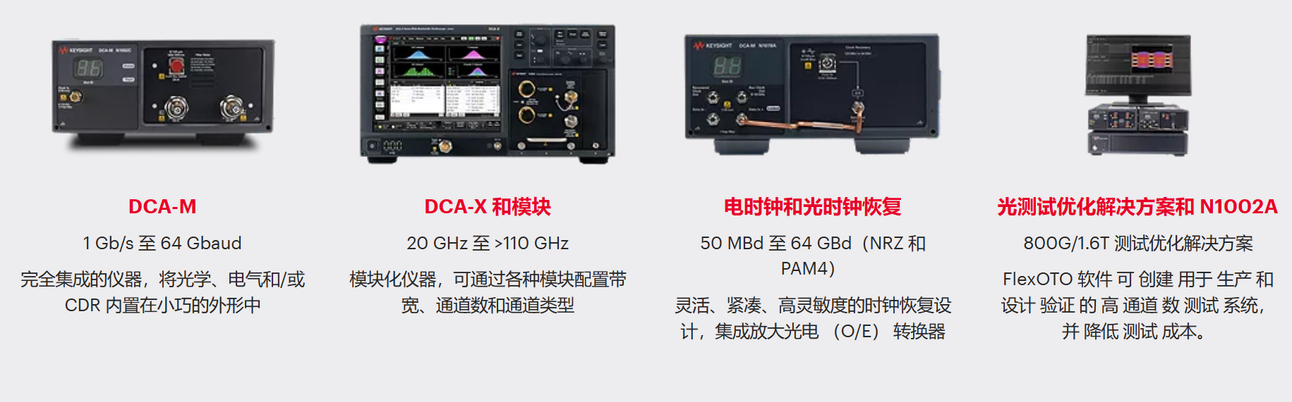 新一代 DCA 等效時間采樣示波器包括 DCA-X 和 DCA-M 兩個系列,分別針對研發(fā)和制造環(huán)境。DCA-X 系列是一種模塊化儀器,可以通過各種插入式模塊來配置主機,執(zhí)行精確的光通信、電氣和時域反射/傳輸(TDR/TDT)測量。DCA-X 系列具有高達 110 GHz 的帶寬,抖動低至 50 fs,噪聲低至 275 μV,以及高達 250 kSa/s 的采樣率。
