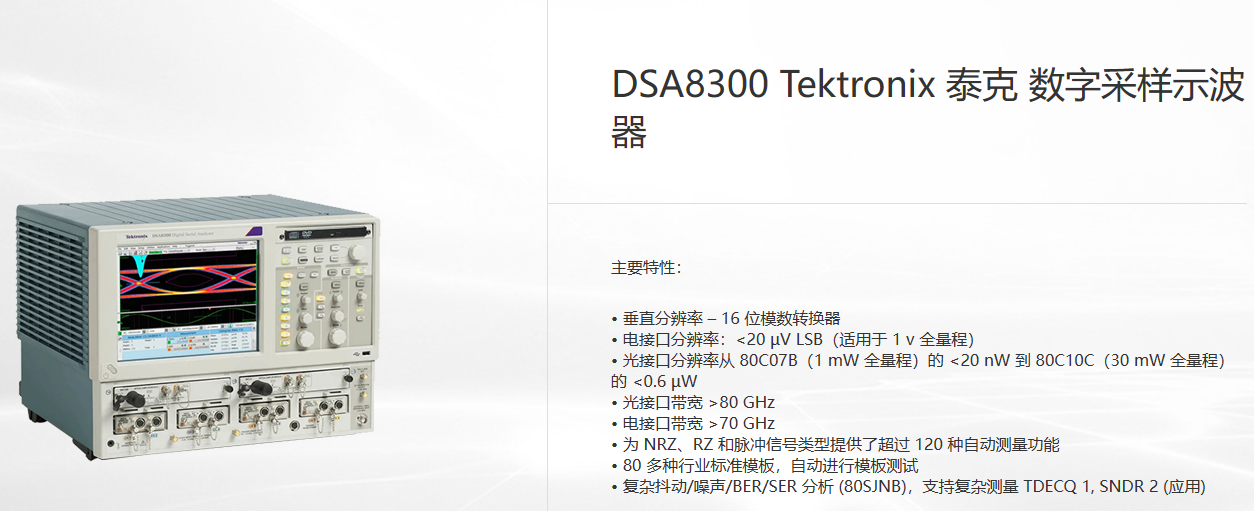 Tektronix DSA8300數(shù)字串行分析儀采樣示波器是一款高性能的儀器,可以用來測試和分析高速光信號和電信號,支持多種光接口標(biāo)準(zhǔn)和應(yīng)用。