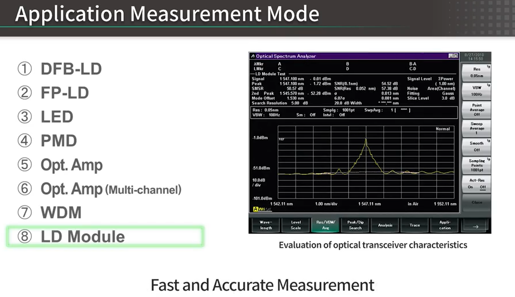 ?  FP-LD:FP-LD 是一種法布里-珀羅激光二極管(Fabry-Perot Laser Diode),具有低成本、高輸出功率、高效率等優(yōu)點(diǎn),廣泛應(yīng)用于光纖通信、光纖傳感、光纖放大器等領(lǐng)域。MS9740B 可以用于評(píng)估 FP-LD 的波長(zhǎng)精度、輸出功率、頻譜寬度等性能指標(biāo)。