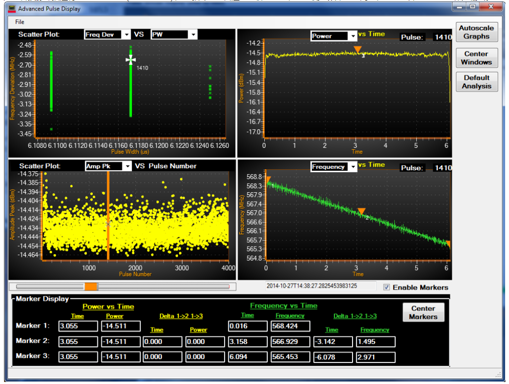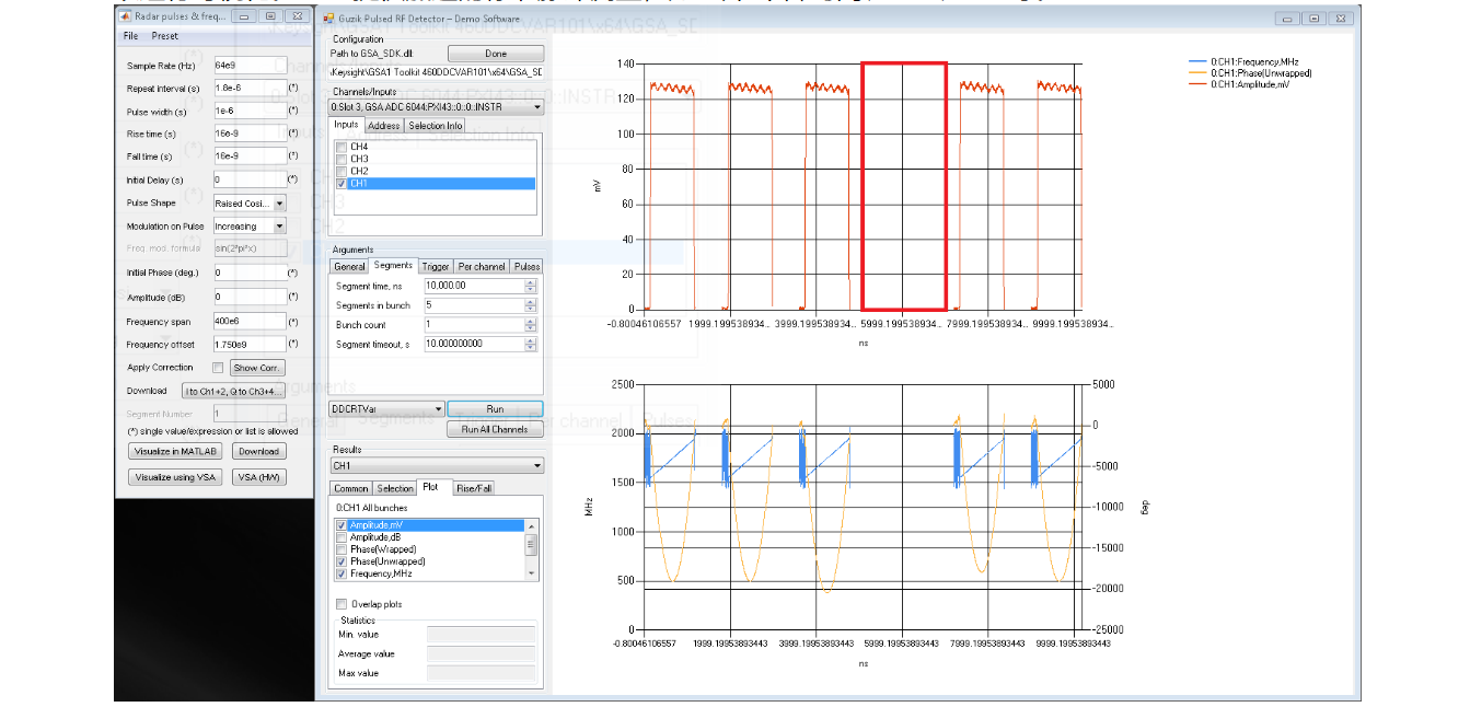 1. 脈沖射頻檢測(cè)器軟件示例程序及其源代碼使用 GSA_SDK,并允許指定脈沖參數(shù)以僅捕獲感興趣的脈沖以進(jìn)行可視化。SDK 提供加速的標(biāo)準(zhǔn)脈沖測(cè)量,如上升/下降時(shí)間、PRF、PRI 等。