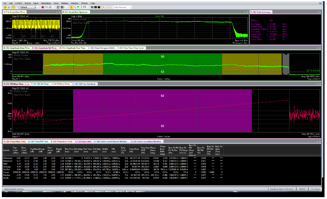 2. 除了使用 VSA 89600 軟件 89601B/BN-BHQ 脈沖分析選件提供靈活的跡線疊加支持之外,還可以通過多個(gè)時(shí)間同步的幅度、相位和頻率 (FM) 跡線結(jié)果詳細(xì)查看脈沖信號(hào)調(diào)制特性和損傷誤差。與功率、下降、過沖、紋波、時(shí)間(上升/下降/寬度/PRI)、頻率、相位和 FM 調(diào)制相關(guān)的所有關(guān)鍵脈沖信號(hào)調(diào)制性能指標(biāo)都可以使用綜合脈沖表表格結(jié)果指標(biāo)進(jìn)行驗(yàn)證。