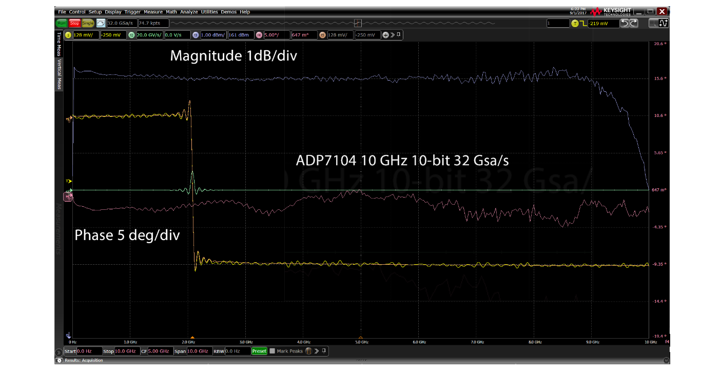 ADP7104 數(shù)字化儀具有出色的頻率響應(yīng)和相位響應(yīng),這對(duì)于寬帶雷達(dá)信號(hào)捕獲至關(guān)重要。獲得專利的群延遲測(cè)量與獲得專利的數(shù)字均衡[1][2]相結(jié)合,創(chuàng)建一個(gè)經(jīng)過校準(zhǔn)的基帶接收器,該接收器在 DC -10 GHz 頻段內(nèi)具有已知的幅度和相位響應(yīng),輸入信號(hào)范圍為 -32 dBm 至 +22 dBm。