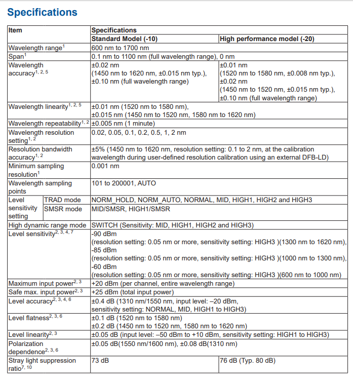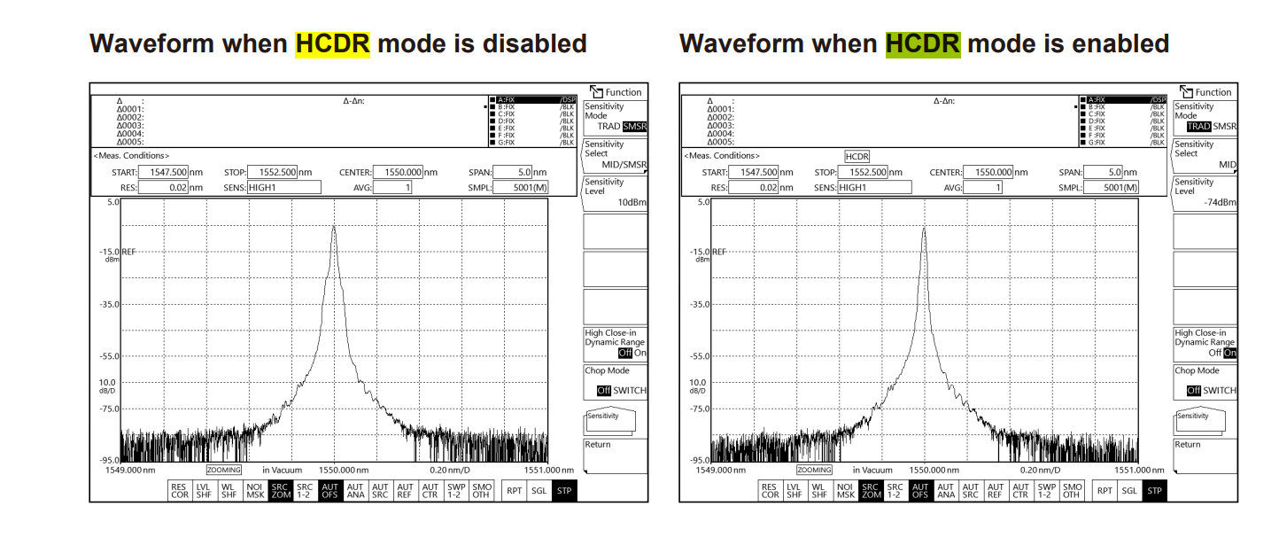?  高性能版(-20)有一個(gè)新的測(cè)量模式,叫做HCDR(高近峰動(dòng)態(tài)范圍)模式,可以使光譜曲線(xiàn)更加銳利,側(cè)模更加清晰,適用于單縱模激光的測(cè)量。
