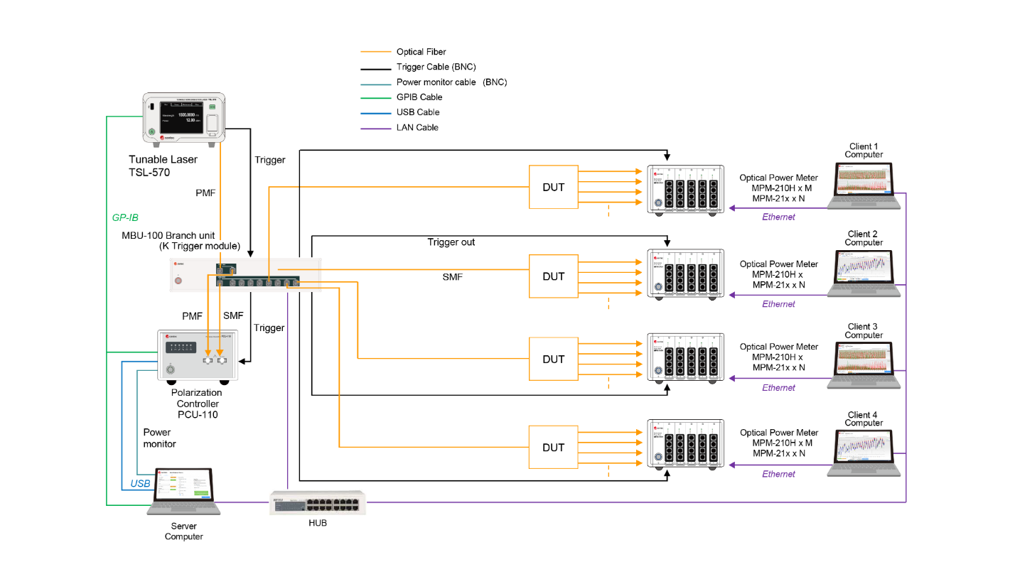 ?  多工位快速掃描測試系統(tǒng):該系統(tǒng)通過將Swept Test System與Multi Branch Unit相組合,可進一步提高測試效率。該系統(tǒng)可以同時對多個光器件進行IL/WDL/PDL測試,支持用戶圖形界面及DLL。