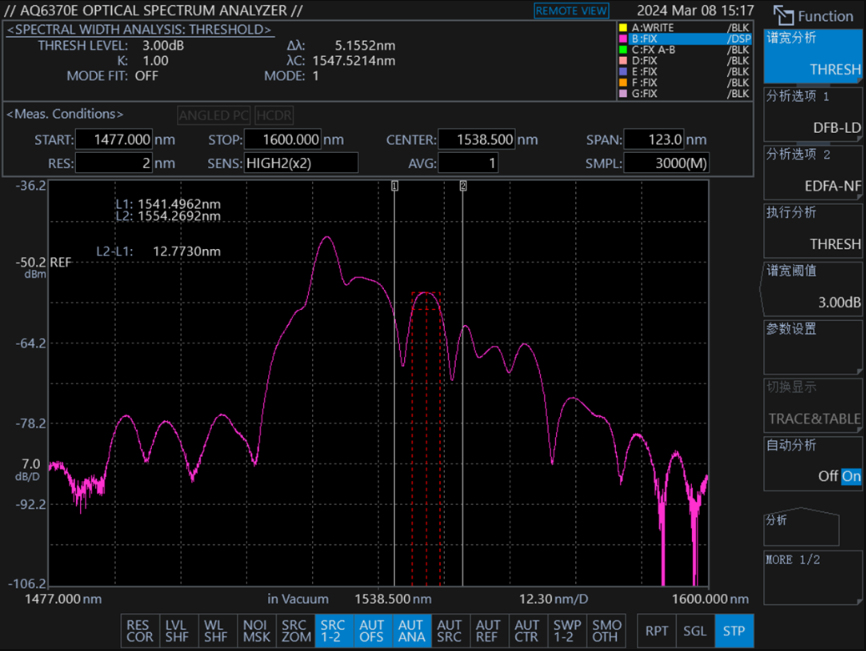 圖4:將整個掃描區(qū)間設(shè)定為執(zhí)行3dB譜寬分析且未開啟設(shè)定線標(biāo)記的L1、L2區(qū)間分析示意圖