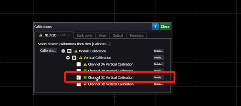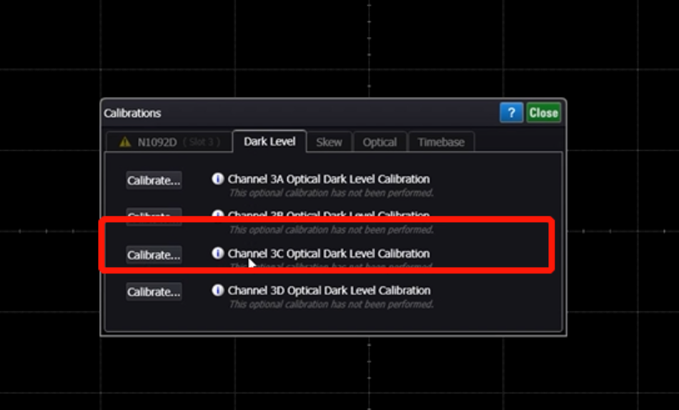 如果自檢過程中發(fā)現(xiàn)任何問題,我們可以進(jìn)行自校準(zhǔn)。在Tools菜單下選擇calibrations,如果沒有光源,可以選擇進(jìn)行前兩項校準(zhǔn)。例如,可以選擇模塊中的第三個通道進(jìn)行校準(zhǔn)。