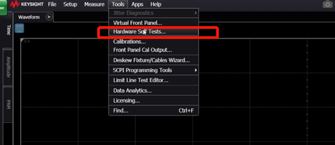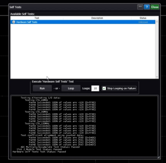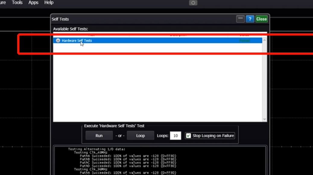 為了確保儀器正常工作,我們可以在Tools菜單下進(jìn)行硬件自檢。選中當(dāng)前模塊并點擊運行,系統(tǒng)會提示前面板上的指示燈顏色變化,以完成不同的測試項目。