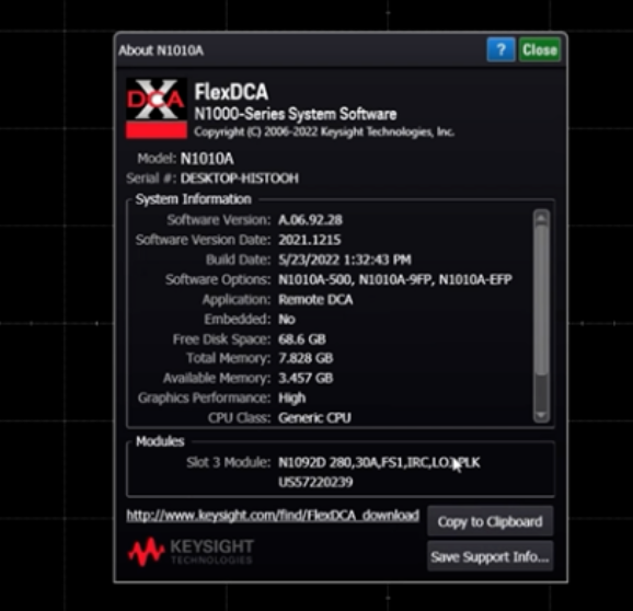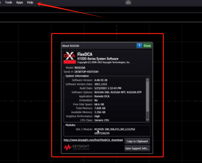 在PC端打開是德科技DCA-M示波器的應(yīng)用程序后,如果有新的模塊加入,程序界面左下角會出現(xiàn)彈窗通知。您還可以通過界面上方的“help”按鈕查看模塊信息,例如本次介紹的N1092D的選件和序列號等。