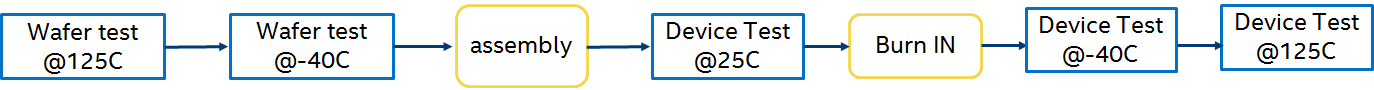 芯片根據(jù)應(yīng)用領(lǐng)域,溫度和可靠性要求的不同,需要定義不同的test insertion。比如汽車電子的產(chǎn)品測(cè)試流程如下共有5個(gè)test insertion,如此多的test insertion是因?yàn)槠囯娮拥腄PM要求zero defect,必須在不同溫度下多次測(cè)試最大限度地篩選新品。